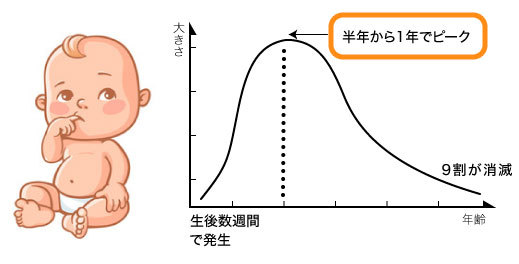 出生時には明らかな赤みはないですが、数週後から隆起してきます。そして半年〜1年の間に最大の大きさになります。ピーク時にかなり大きくなると、その成長過程に伸びた皮膚が、元に戻らず盛り上がりが将来的に残ってしまうので、早期からのレーザー治療が、大きさの増大を抑えてくれます。また外傷で出血しやすい事もあるので、早めにレーザーを照射して消退させる乳児の方が増えています。