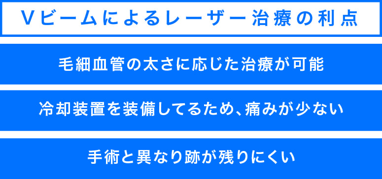 色素レーザーの光は標的である皮膚表面の血管を(赤血球)を瞬間的に焼灼しますので、周囲の正常皮膚組織へのダメージが少ないのが特徴です。この治療は単純性血管腫、毛細血管拡張症、クモ状血管腫、苺状血管腫、その他皮膚の赤あざに有効で、それらの色を薄くしたり、消すことが出来ます。