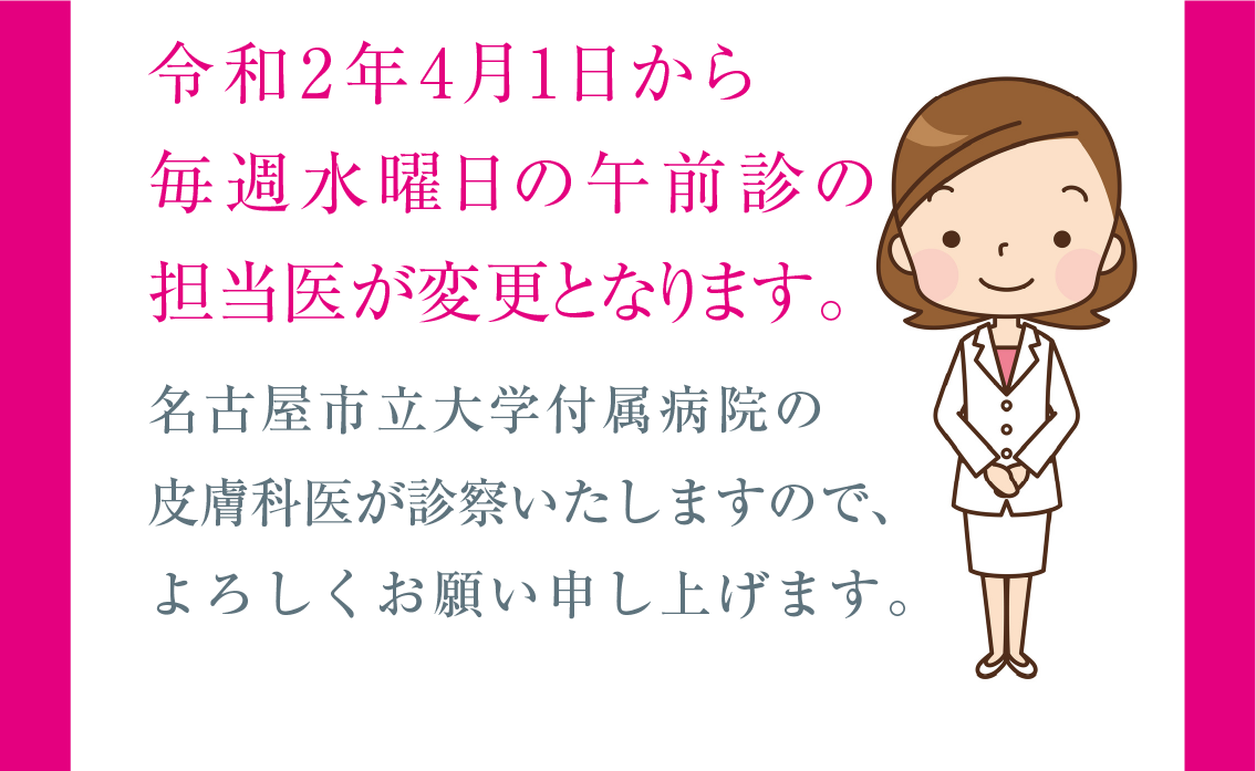 平成19年5月に天白区塩釜口に開院以来、日々の診療にスタッフ一同が皮膚科クリニックとして全力を尽くしております。当皮膚科クリニックでは、居心地の良い空間作りを心がけ、きめ細かい対応で日々患者様と接しています。皆様との対話を通じて、お肌の健康と美容を共に考え、お役にたちたいと思っています。どんな事でもお気軽にご相談下さい。安心してお話頂けます。どうぞよろしくお願いします。