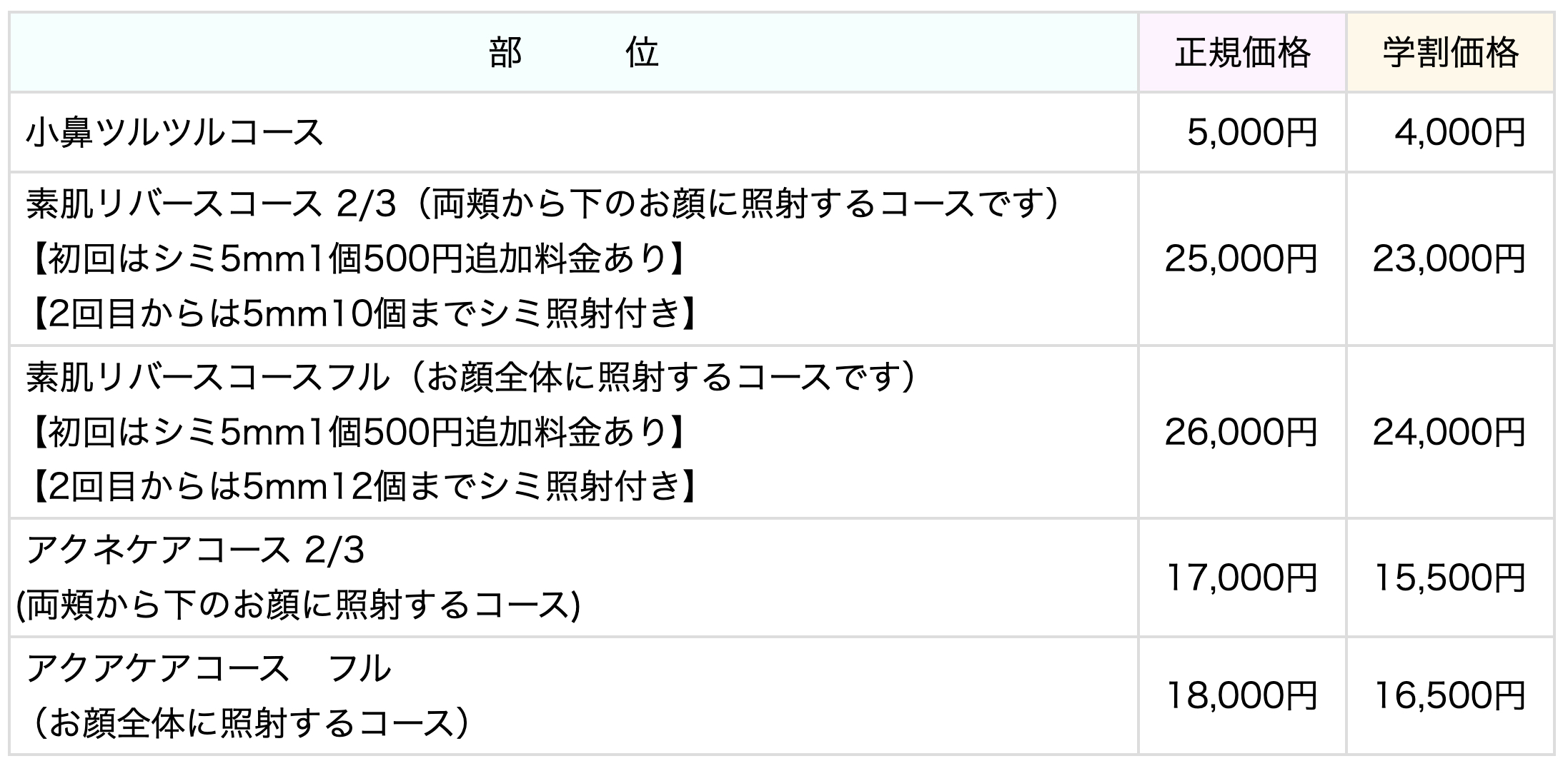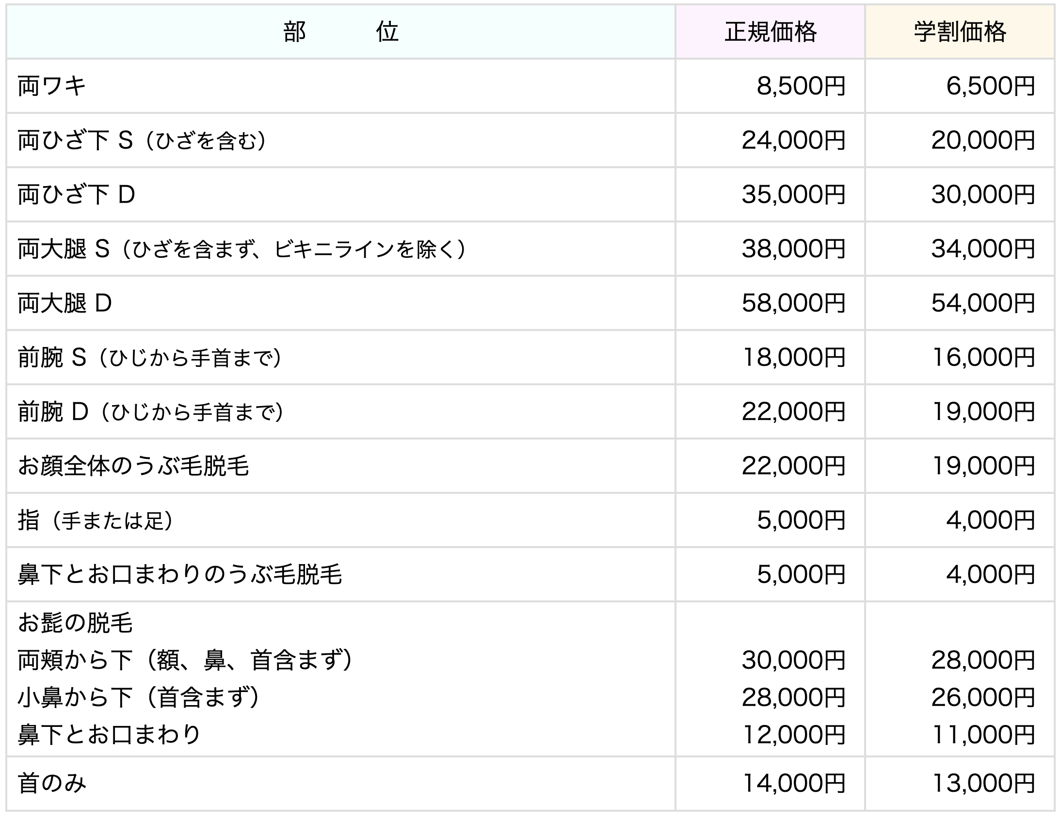 レーザー脱毛、レーザーフェイシャル・ピーリングは、それぞれ施術間隔が6ヶ月以内であれば、5回目からは学割価格となります。